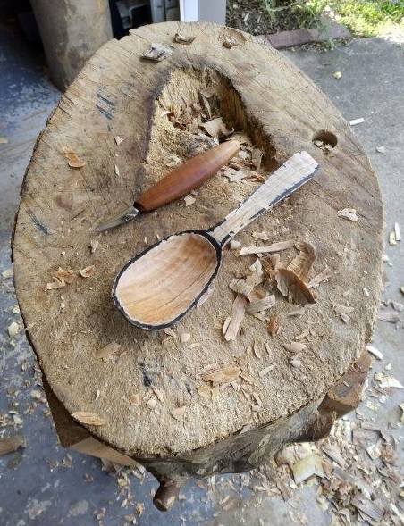 Having left most of its billet behind, the spoon is currently resting in the wood chips. It’ll wait there – patiently – for the next round of work to shape it into something a bit more viable…