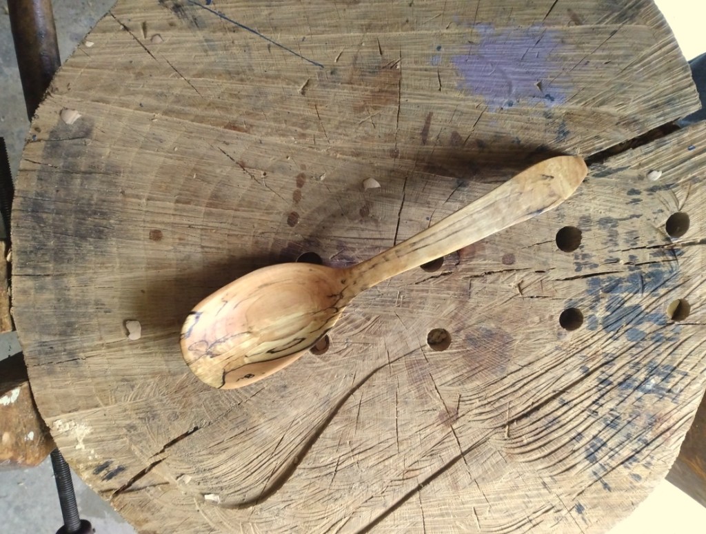 The intricate patterns and discoloration seen in this Beechwood spoon are the result of a process known as spalting, which occurs when an external fungus growing on the surface of a dead tree sinks its tendrils deep into the fiber of the wood in order to feed itself. Aside from potentially weakening the structure of the wood, spalting also causes the type of patterning displayed here when those tendrils create an armor of protein for protection.