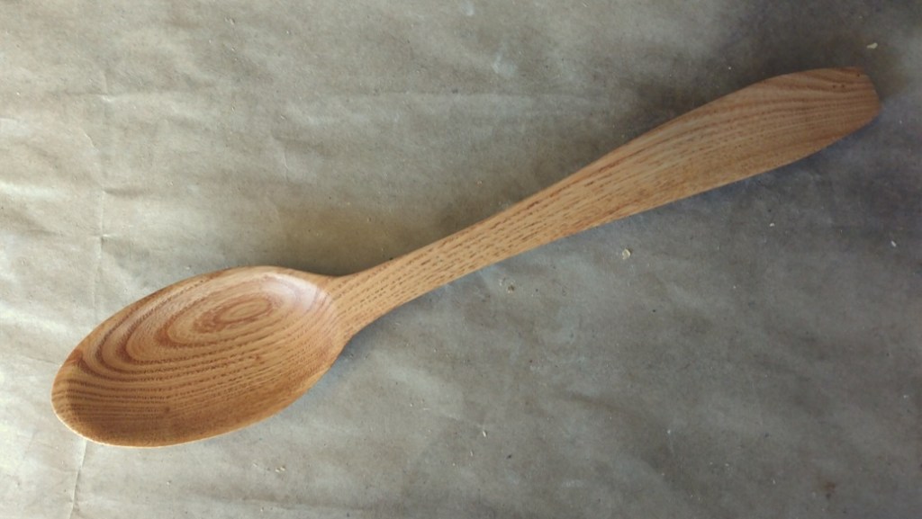 I spent the day finishing up a commission piece for a very generous patron who wanted “a longer spoon with grain you can see.” I went with Butternut because the grain is prominent anyway, but I also rubbed it down with cinnamon before I burnished it. During this process, the cinnamon imbeds itself into the grain and really makes it pop, especially with a lighter wood like Butternut.